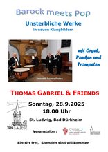Unter dem Titel „Barock meets Pop“ werden unsterbliche Werke mit Orgel, Pauken und Trompeten in neuen Klangbildern präsentiert. Die Vollblutmusiker um Thomas Gabriel, der schon öfters in Bad Dürkheim gastiert hat, werden hierbei den farblich beleuchteten Kirchenraum mit Klängen geradezu fluten. Neben dem Concerto in D-dur von Antonio Vivaldi erklingt u.a. das legendäre „Music“ von John Miles sowie die „Bohemian Rhapsody“ des unvergessenen Freddy Mercury. Ebenso können sich die Zuhörer auf die legendären Stücke „We are the world“ von Michael Jackson sowie „Imagine“ von John Lennon freuen.